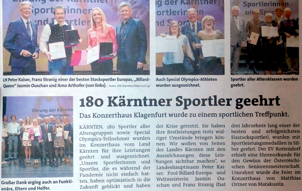 Im Konzerthaus-Klagenfurt erhielt die Herrenmannschaft des EV Rottendorf Seiwald für den Seniorentitel bei den österreichischen Meisterschaften in Saarleinsbach (OÖ) die Ehrenurkunden. Insgesamt wurden 180 Sportler von Landeshauptmann Peter Kaiser und Landessportdirektor Arno Arthofer geehrt. Eine besondere Auszeichnung wurde Franz Stranig zuteil, er erhielt für seine zahlreichen sportlichen Erfolge, gemeinsam mit Kärntens Billard-Queen, Jasmin Ouschan, die Sportleistungsmedaille in Silber. Es war eine gelungene und würdige Veranstaltung die zu Ehren aller erfolgreichen Kärntner SportlerInnen stattfand, und mittendrinnen die freudestrahlenden Rottendorfer.
