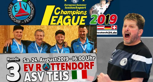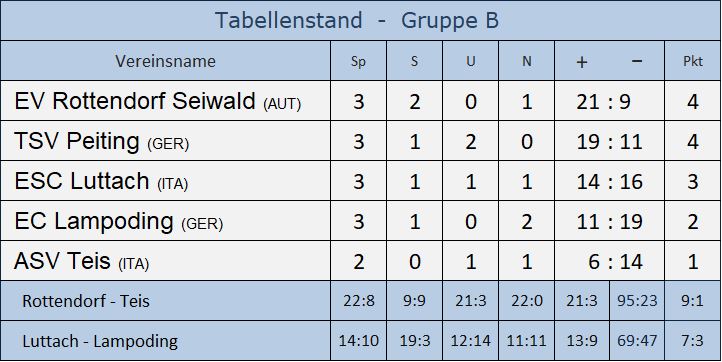 Überraschend deutlicher Sieg des EV Rottendorf in der 3. Runde der Champions League! In der Gruppe B schoss man Teis (It) in Liebenfels trotz erstzgeschwächter Truppe voll ab. Ohne die Asse Andi Spendier und Markus Wallner fuhren die Mannen von Coach Franz Stranig mit 9:1 über die Italiener drüber. "Das hat sich so keiner erwartet!", jubelte Stranig. Jetzt lacht Rottendorf sogar punktegleich mit Peiting von der Spitze, reicht im Auswärtsspiel bei den Deutschen am 7. September schon ein Punkt für das "Final Four"!