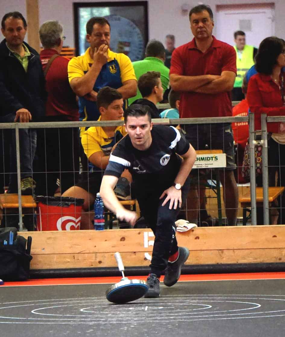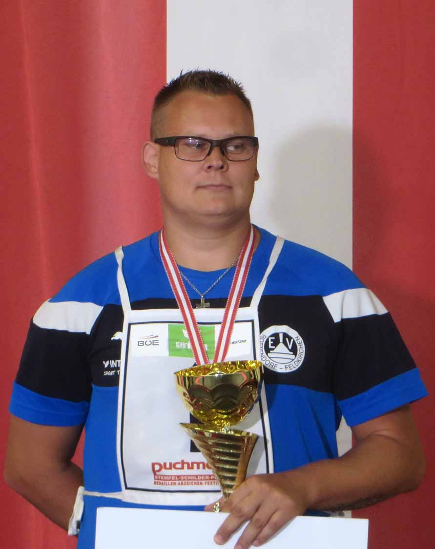 Das hätte sich Markus Wallner wohl auch nicht erwartet, als er am Ende der österreichischen Ziel-Staatsmeisterschaft der Herren vom obersten Treppchen der Glückseligkeit lächeln durfte. Damit bekam Franz Stranig als bisher einziger Rottendorfer Herren-Staatsmeister endlich Gesellschaft und gratulierte dem Rottendorfer "Wabbel-Triplanski" im Rahmen der Siegerehrung zum sensationellen Erfolg. Bereits nach dem Grunddurchgang punktegleich mit dem Führenden auf Platz zwei gelegen, zündete Markus den Turbo und legte mit 177 Punkten die höchste Durchgangsleistung aller 9 Finalisten auf den Klagenfurter Asphalt. Mit Kevin Kronewetter gelang sogar noch einem zweiten Rottendorfer der Sprung in das 9er-Finale.