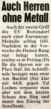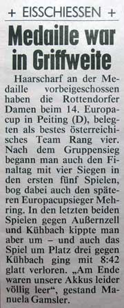 Dank der besseren Platzierung vom Vortag war Rottendorf wieder auf Bahn 1 und spielte nun gegen das deutsche Team von Außernzell um den Finaleinzug. Doch plötzlich war von Treffsicherheit, Leidenschaft und Kampfgeist nichts mehr zu sehen und Rottendorf verlor mit 10:22 ganz klar. Aufgerieben, im ständigen Kampf auf Bahn 1 zu verbleiben, waren die "Batterien" komplett leergefahren, und so gab es im Spiel um Bronze eine glatte 8:42 Schlappe. Dennoch verdient die Leistung der Rottendorfer Damen, die das Feld so lange angeführt hatten, großen Respekt.