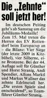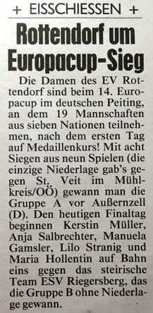 Mit dem 14. Europacup der Damen geht heute und morgen im deutschen Peiting das erste Highlight der neuen Saison Szene. Kärnten ist durch die Damen des EV Rottendorf vertreten, die 2014 in Peuerbach (OÖ) bereits die Silbermedaille erobert haben. Weiters mit dabei Titelverteidiger ESV Vornholz, ESV Riegersberg (beide St) und St. Veit/Mühlkreis (OÖ) insgesamt starten 19 Mannschaften aus sieben Nationen. In der Gesamtwertung hat Deutschland mit acht Siegen gegenüber Österreich mit fünf (darunter zwei durch den EV Edelweiß - 2009 und 2010) die Nase vorn.