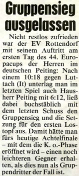 Immer an der Spitze liegend musste man gegen den ewigen Rivalen aus Luttach in der 4. Spielrunde mit einer 10:18 Niederlage die Tabellenführung an die Südtiroler abgeben. Eine Runde später lag das Team wieder voran, aber im letzten Spiel verlor Rottendorf gegen den Lokalmatador aus Peiting mit 6:12 und fiel dadurch noch auf Rang 3 zurück. Für die Auslosung wird das Team nun in Topf zwei gesetzt und bekommt es im sonntägigen Achtelfinale nunmehr mit einem Gegner aus Topf drei zu tun.