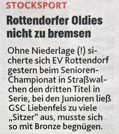 In Kundl ging Rottendorf als Favorit ins Rennen und lag in der Gruppe Rot, dank eines 10:3 Derbysieges gegen ASKÖ ER St. Ulrich, von Beginn an der Spitze. Nur einmal musste das Team nach einem 1:6 gegen Straßwalchen (S) in der 4. Runde die Führung abgeben, aber danach lief das Werkl wieder geschmeidig und Rottendorf siegte mit zwei Punkten Vorsprung auf EV Straßwalchen. Im Finale kam es zum „Namensderby“, Krottendorf (ST) gegen Rottendorf (K), dabei stand es nach sechs Kehren 6:6 Unentschieden. Im anschließenden Ringmassen setzten sich die Tiebelstädter mit 14:8 durch und schlossen eine äußerst erfolgreiche Wintersaison mit dem 4. Senioren-Titel in Folge