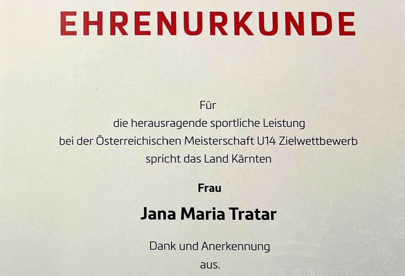 Jana Tratar war erstmals bei Sportlehrehrung des Landes Kärnten mit dabei. In Klagenfurt (Konzerthaus) trafen sich die erfolgreichen Sportler zu den Feierlichkeiten und mit dabei war Rottendorfs Jüngste Spielerin, Jana Tratar. Die Ehrung basierte auf Grund der erfolgreichen Leistung aus der Wintersaison, bei der Jana Tratar erstmals den ÖM-Titel im U14-Zielbewerb gewann.