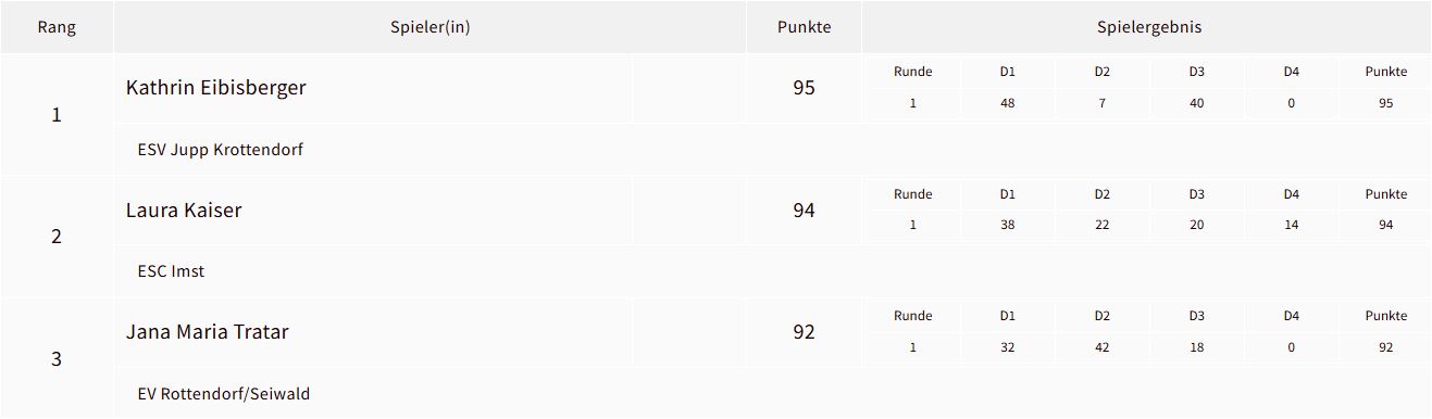 Spannung bis zum Schluss wurde im ersten Bewerb der U14 Klasse geboten. Ein Kopf an Kopf Rennen bis zur letzten Bahn und die Vierer-Bahn entschied wiedermal wie so oft im Zielwettbewerb über Sieg und Niederlage. Kathrin Eibisberger und Jana Maria Tratar führten mit 95 und 92 Punkten mit komfortablem Vorsprung das Feld an. Beide verhauten die letzte Bahn komplett, der Vorsprung reichte aber Kathrin Eibisberger zum Sieg. Laura Kaiser verdrängt mit einer 14 auf der letzten Bahn noch Jana Maria Tratar auf Platz 3. Emilia Raba katapultiert sich mit 20 Punkten auf der letzten Bahn auf Platz 4.