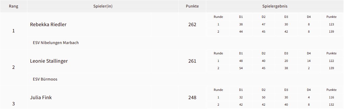 Eine denkbar knappe Entscheidung gab es im U19 Bewerb. Nach dem ersten Durchgang führte Rebekka Riedler nur einen Punkt vor Leonie Stallinger. Im Finaldurchgang schenkten die beiden Girls sich nichts. Leonie legte auf der ersten Bahn mit 54 (!) Punkten vor. Auf der zweiten Bahn beide mit einer 45, Bahn 3 geht mit 42 Punkten an die Niederösterreicherin. Mit 5 Punkten Vorsprung für Leonie ging es auf die letzten Bahn. Rebekka Riedler behielt die Nerven und sichert sich hauchdünn mit 1 Punkt Vorsprung auf Leonie Stallinger den Tagessieg. Julia Fink belegt Platz 3 vor Natalie Aberger.