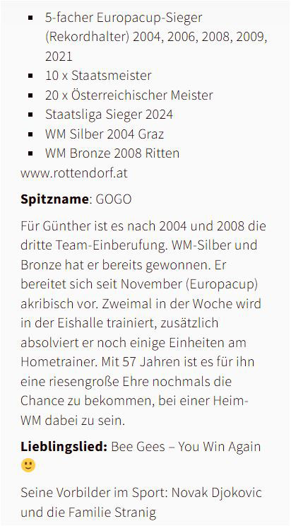 Der Oldie wurde kurz vor der Meisterschaft reaktiviert, noch schnell mal 3 Trainings auf Eis und es ging auf zur Staatsmeisterschaft. Am ersten Tag sah man die fehlende Vorbereitung auch bei diesem Ausnahmekönner, aber am zweiten Tag agierte Mr. Emotionale 6 Spiele lang als Maschine ohne Fehl und Tadel und hielt sein Team dadurch stets auf Kurs im Kampf um den Klassenerhalt. Unterstützung bekam er von einem weiteren Oldie, Günther Gogo Stranig agierte souverän als 1. Stockschütze und brillierte vor allem als genialer Stockversenker, so dass die Gegner oft vor fast unlösbaren Spielsituationen standen.