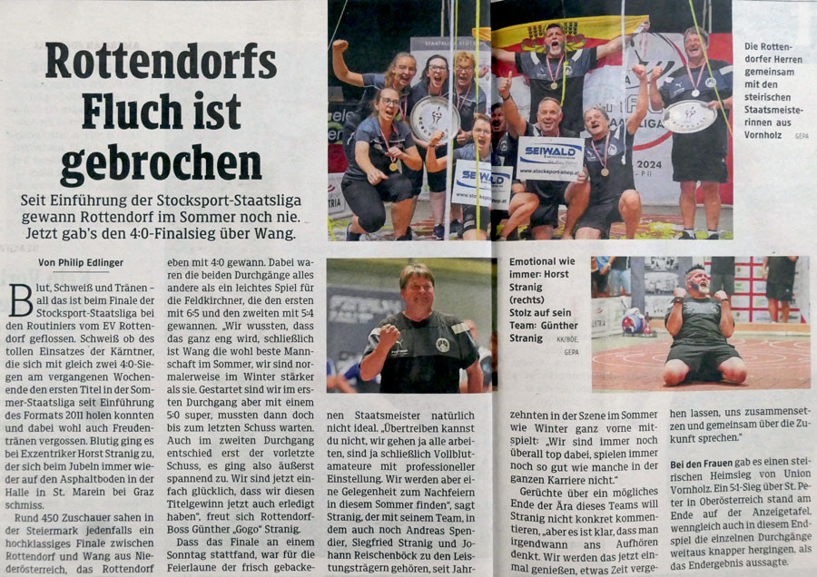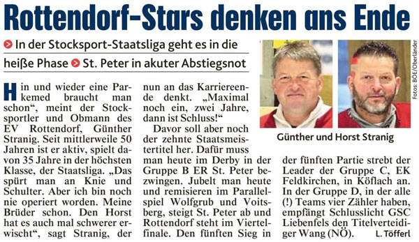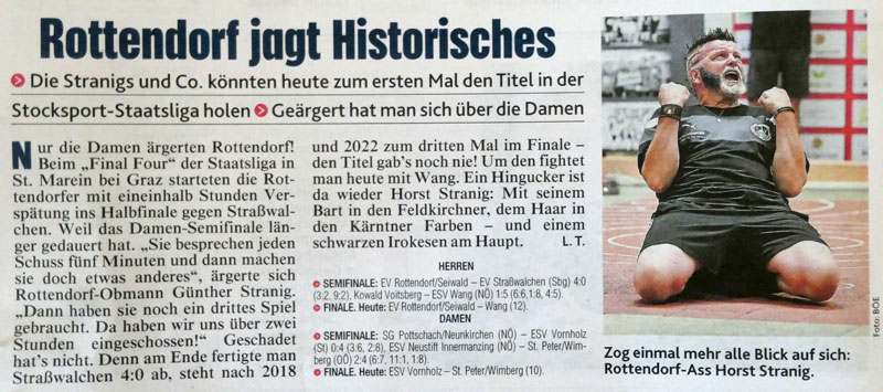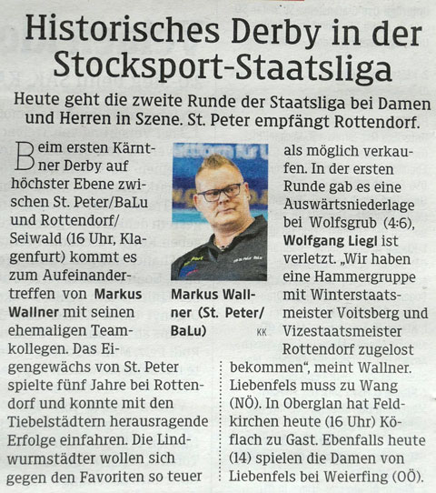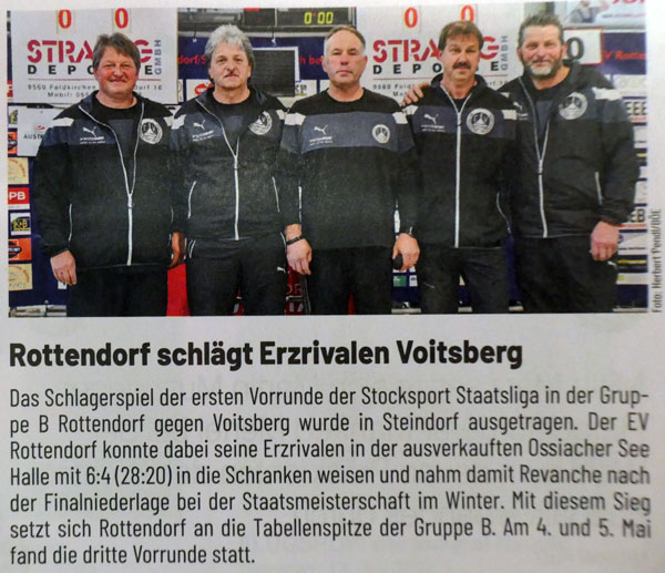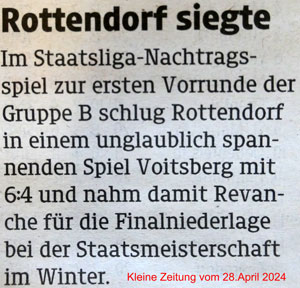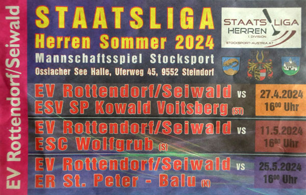Im Rahmen des der Finalentscheidung wurde am 15. Juli 2023 in Liebenfels die Gruppeneinteilung für die kommende SL-Meisterschaft der Herren ausgelost. Rottendorf wurde aus Topf 3 dem ESV Voitsberg (St) zugelost. In der Vergangenheit biss sich Rottendorf an dieser „Steierer-Nuss“ ab und an die Zähne aus, aber Nüsse knacken ist auch eine sportliche Leidenschaft von Rottendorf. Zu einer Premiere kommt es in der Begegnung mit St. Peter – erstmals seit Bestehen der reformierten Staatsliga gibt kommt es zu einem Aufeinandertreffen zweier Kärntner Teams. Alle freuen sich auf dieses emotionsgeladene Derby, denn für beide Teams scheint ein volles Haus garantiert zu sein und spannend wird diese Begegnungen sowieso sein. Aus dem Topf 4 gesellte sich der ESC Wolfgrub (S) hinzu, der Aufsteiger aus der Bundesliga ist das unbeschriebene Blatt in dieser Gruppe. Aber Geschichten die erzählt werden bevor sie noch geschrieben wurden sind immer mit Vorsicht zu genießen.