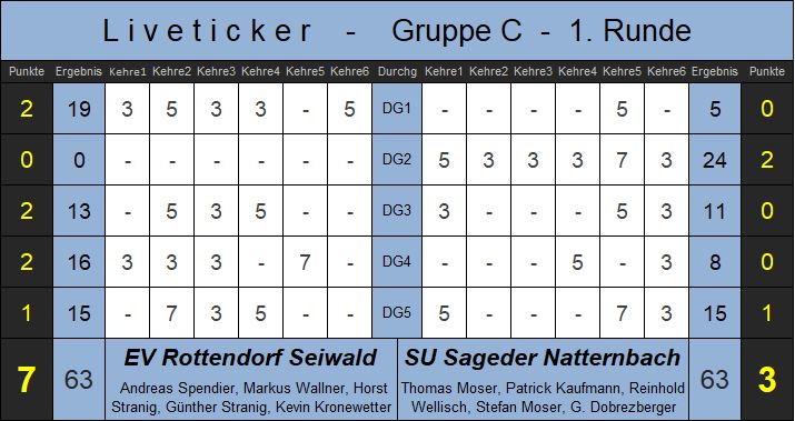 Die Tiebelstädter starteten souveränen in die Meisterschaft, siegten im ersten Durchgang klar mit 19:5. Aber dann schlug Natternbach zurückschlug und überrollte Rottendorf mit 24:0. Nach der Pause war es das stimmungsvolle Spiel zweier gleichwertiger Teams mit dem besseren Ende für die Heimmannschaft. Die Oberösterreicher konnten die vorhandenen Chancen nicht nutzen und Rottendorf hatte Horst Stranig, der an diesem Abend den Unterschied ausmachte.