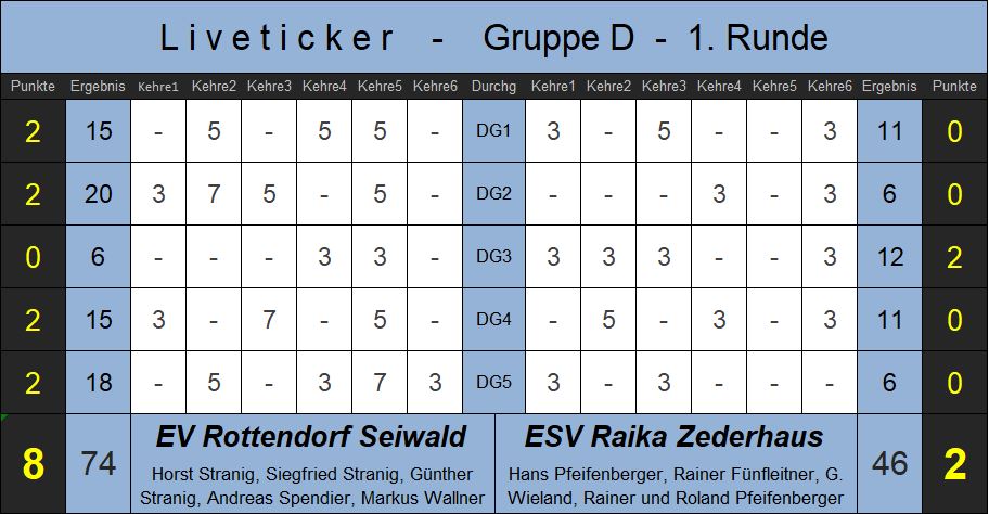 EV Rottendorf Seiwald wird unverändert an den Start gehen - und wie könnte es anders sein - beim "ESV Stranig" stehen gleich fünf Stranigs in der Kaderliste. Günther Stranig wird gemeinsam mit Andreas Spendier, Horst Stranig und Markus Wallner im ersten Heimspiel auf neuer Anlage gegen den ESV Zederhaus antreten.
