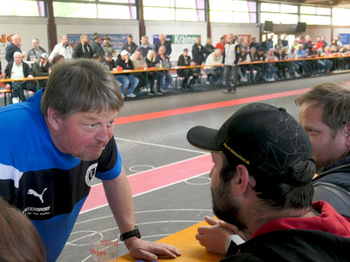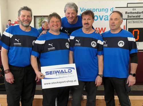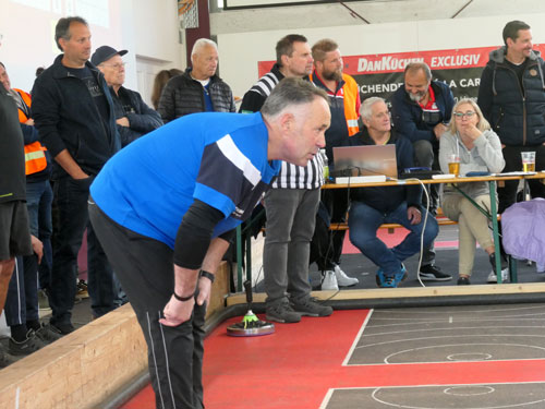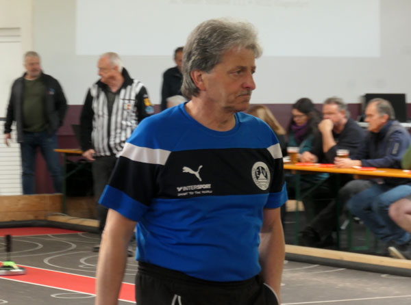 In der Gruppe B war alles angerichtet für ein großes Sportfest – 300 Fans in der Halle und beste Stimmung bei der Begrüßung. Danach kam nicht wirklich Stimmung auf, Rottendorf dominierte die ersten beiden Durchgänge und ging schnell mit 4:0 in Führung. St. Peter ohne Wolfgang Liegl ging nach der Pause erstmals in Führung (3:2 nach vier Kehren). Horst Stranig punktete in Kehre 5 mit einem Dreier und brachte sein Team mit 5:3 in Front. In der letzten Kehre verletzte er sich unglücklich, konnte aber dennoch mit seinem Schuss das Spiel noch neutralisieren. St. Peter macht nur einen Punkt und verliert Durchgang 3. Somit war nach drei Durchgängen die Partie bereits mit 6:0 für Stranig & Co entschieden. Für Horst Stranig kam danach sein Bruder Siegfried in Durchgang 4 ins Spiel. St. Peter gelang mit dem Gewinn der letzten beiden Durchgänge noch eine Ergebniskorrektur. Ein Einstand nach Maß für die Tiebelstädter.