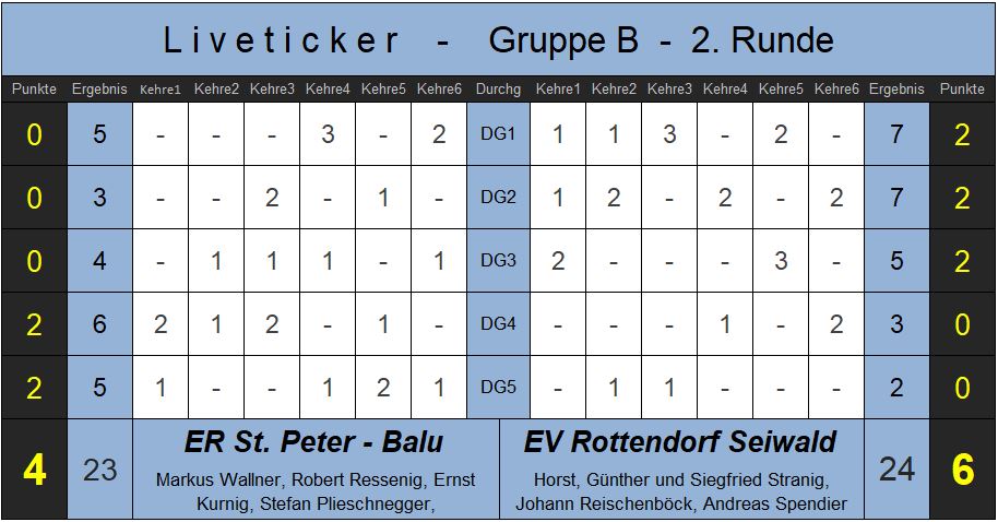 Rottendorf präsentierte hellwach, machte kaum Fehler und ließ das Heimteam nicht ins Spiel kommen. ER St. Peter agierte nicht konstant genug um Rottendorf in Bedrängnis zu bringen. Erst im dritten Durchgang gab es einen offenen Schlagabtausch mit großartigen Versuchen auf beiden Seiten und dem glücklicheren Ende für Rottendorf. Aber das 6:0 war teuer erkauft, denn Horst Stranig musste verletzt aufgeben als er bei einem Schussversuch mit dem Standbein wegrutschte. St. Peter nutzte die personelle Unordnung von Rottendorf folglich zum Gewinn der letzten zwei Durchgänge und konnte das Ergebnis auf 4:6 verbessern.