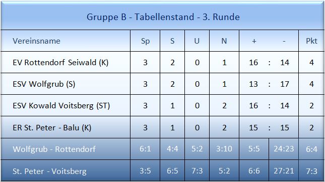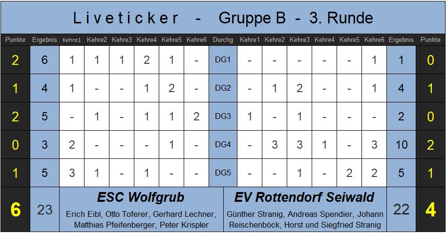 Nach drei Durchgängen stand es bereits 5:1 für die Salzburger. In Durchgang 4 können die Rottendorfer mit 10:3 anschreiben. Ein Remis schien in Reichweite. Die Wolfgruber ließen sich nicht aus der Ruhe bringen, schreiben in Durchgang 5 gleich mit einer 3 in der ersten Kehre an. Ein 5:5 Remis zum Ende der Partie beschert den Wolfgrubern nach dem 6:4 Heimsieg in der ersten Runde gegen St. Peter den zweiten Sieg in der Vorrunde. Mit diesem Sieg setzen sie sich punktgleich mit Rottendorf an die zweite Stelle der Tabelle.