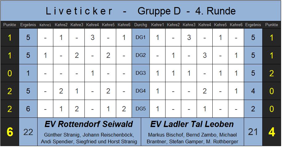Rottendorf gelingt die Revanche für die Niederlage vor einer Woche. Wie schon im Hinspiel ein Spiel auf höchstem Niveau – zwei Unentschieden in den ersten beiden Durchgängen. Der 3. Durchgang geht mit 5:1 an Tal Leoben. Im vierten Durchgang entscheidet ein Maßfehler von den Steirern zugunsten von Rottendorf. Im letzten Durchgang zwei Fehlschüsse der Taler. Für Rottendorf war dieser Sieg immens wichtig, mit drei Punkten bleiben die Tiebelstädter am Tabellenende dieser Gruppe.