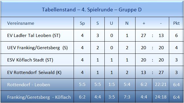 Bei einer weiteren Niederlage ist für die Kärntner das Viertelfinale nur noch schwer erreichbar, vor allem dann wenn im zweiten Spiel Köflach-Stadt voll punktet. EV Ladler Tal Leoben wird in jedem Fall diese Runde als Tabellenführer überstehen. Bei einem Sieg ist das VF-Ticket gebucht. Auch für den UEV Franking-Geretsberg bestehen bei einem Sieg gegen Köflach gute Chancen aufs Viertelfinale – auf jeden Fall eine richtungsweisende Runde für alle vier Teams.