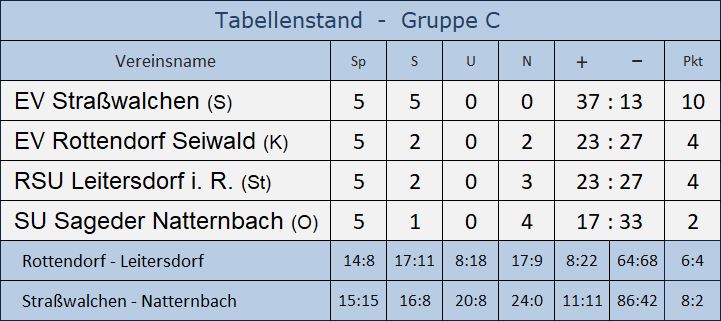 Straßwalchen ist durch und kann mit einem Punktgewinn nicht mehr von Platz 1 gestoßen werden. Spannung verspricht das Spiel in Liebenfels zwischen Rottendorf und Leitersdorf - die Kärntner brauchen einen Sieg, um nicht in ernsthafte Abstiegs-Nöte zu kommen. Siegt Natternbach in Straßwalchen und Rottendorf gewinnt, könnte sich Natternbach mit einem dritten Sieg sogar Platz 2 holen.