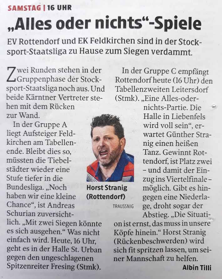 Der EV Rottendorf gewann das Staatsligaspiel gegen RSU Leitersdorf (St) mit 6:4. Mit einem Sieg in natternbach (OÖ) könnten die Rottendorfer noch den Einzug in das Viertelfinale schaffen.