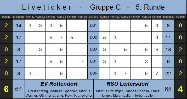 Rottendorf erwischt den besseren Start und ging ohne zu glänzen mit 4:0 in Führung. Es sah nach einer klaren Angelegenheit aus, aber Leitersdorf kam nach der Pause stark zurück und schien bereits auf der Überholspur, aber im vierten Durchgang vergeigten sie den möglichen Ausgleich. Rottendorf feierte hingegen einen wichtigen 6:4 Erfolg im Kampf gegen den Abstieg.