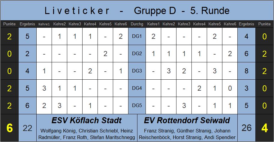 Der erste Durchgang verlief ausgeglichen ehe es im Finish noch knapp danebenging. Danach waren die Tiebelstädter das dominantere Team und gingen verdient mit 4:2 in Führung und schienen Richtung Viertelfinale unterwegs zu sein. Köflach reagierte daraufhin mit einem Spielerwechsel und das Match begann zu Gunsten der Weststeirer zu kippen. Es waren Treffer ohne Spielglück und Fehlversuche zum falschen Zeitpunkt die Rottendorf auf die Verliererstraße brachten. Aber selbst mit dem Rücken zur Wand stehend, beeindruckten die Tiebelstädter mit ihrem Kampfgeist und Willen dem Spiel doch noch eine Wende zu geben. Erst mit dem allerletzten Versuch dieses Duells konnte ESV Köflach Stadt über den 6:4 Sieg jubeln und hat nun seinerseits die besten Chancen das Viertelfinale zu erreichen.