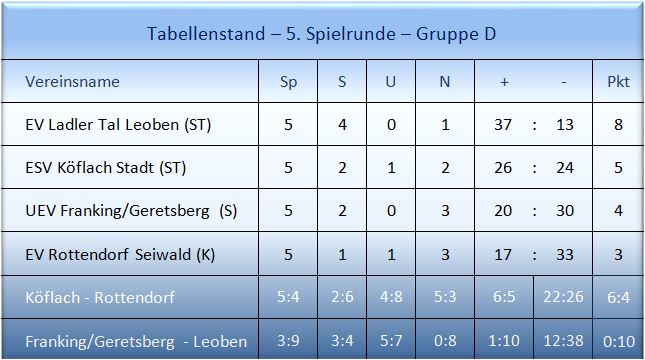 In dieser Gruppe hat EV Ladler Tal Leoben auswärts gegen UEV Franking-Geretsberg alle Trümpfe in der Hand, um die Tabellenspitze erfolgreich zu verteidigen. Viel Spannung gibt es im Spiel in Köflach zwischen ESV Köflach Stadt und EV Rottendorf Seiwald. Können sich die Tiebelstädter am Ende doch noch befreien und mit zwei Siegen das Feld von hinten aufrollen? Bei einem Sieg der Köflacher droht der erfolgreichsten Eis-und Stocksportmannschaft der letzten Jahre der Abstieg, vor allem dann, wenn Franking in dieser Runde voll punktet.