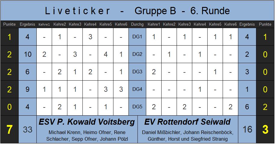 Rottendorf stand schon vor dem Spiel als Gruppensieger fest. Voitsberg punktgleich mit Wolfgrub auf Platz 2. Die Voitsberger ließen heute im letzten Gruppenspiel nichts anbrennen, in Durchgang 1 konnten die Rottendorfer mit einem Remis punkten. Danach klare Durchgangsgewinne der Steirer und ein 7:3 Heimsieg. Mit dem zweiten Platz in der Tabelle sichern sich die Voitsberger das zweite Viertelfinalticket.