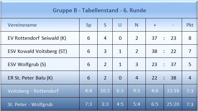 In der Gruppe B steht EV Rottendorf/Seiwald als Gruppensieger fest. Die Kärntner haben damit auch Heimrecht im Viertelfinale. Dort wartet der Zweite der Gruppe C entweder Großfeistritz oder St. Willibald. Auf Platz zwei ESV SP Pongratz Kowald Voitsberg punktgleich mit dem ESC Wolfgrub. Voitsberg muss zu Hause gegen Rottendorf gewinnen, um sicher im Viertelfinale zu stehen. Bei einer Niederlage und einem Unentschieden oder einem Sieg von Wolfgrub bei St. Peter winkt nur der Steherplatz. Aufsteiger Wolfgrub könnte mit einem Auswärtssieg in Klagenfurt und Schützenhilfe von Rottendorf für die große Sensation der Vorrunde sorgen. ER St. Peter/Balu steht als Absteiger bereits fest.