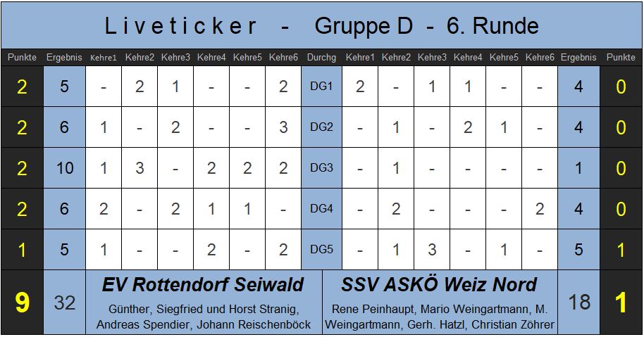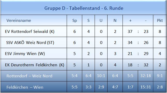 Die Ausgangslage vor dem Spiel war klar, ein Punktegewinn von Rottendorf bedeutete einen fixen Viertelfinalplatz. Die Tiebelstädter schafften tatsächlich den erhofften Traumstart gegen den Tabellenführer aus Weiz und gingen mit einer 4:0 Führung in die Pause. Der Wermutstropfen dabei war, das verletzungsbedingte Ausscheiden von Horsti „Emotionale“ Stranig im zweiten Durchgang. Aber Rottendorf agierte weiter beständig, gewinnt auch nach der Pause und nutzt die sich auftuende Chance auf den Gruppensieg, durch ein 6:4 im vierten Durchgang. Rottendorf spielt nun am 28. Juni zu Hause in Steindorf gegen den ESC Wolfgrub (S) um den Aufstieg in das FinalFour.