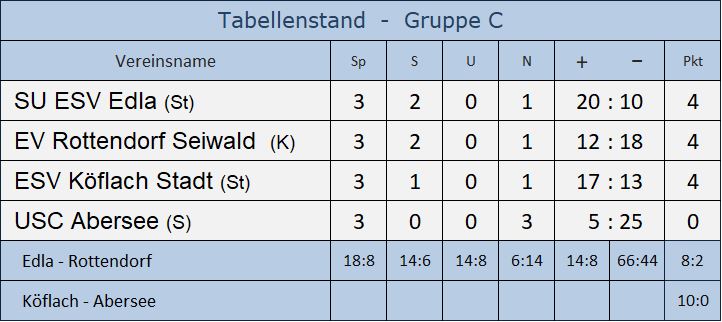 Rottendorf kommt als Tabellenführer zum Schlagerspiel nach Edla Es wird aber eine schwierige Aufgabe, denn trotz zweier Siege konnte Rottendorf bisher nur teilweise überzeugen. Gegen die starke Truppe von Edla wird eine Steigerung notwendig sein um in der Gruppe C weiter vorne zu bleiben.
