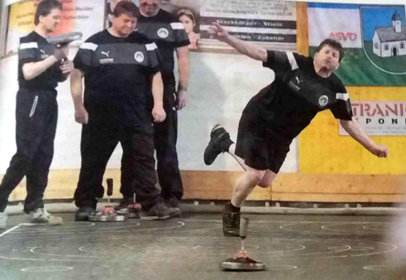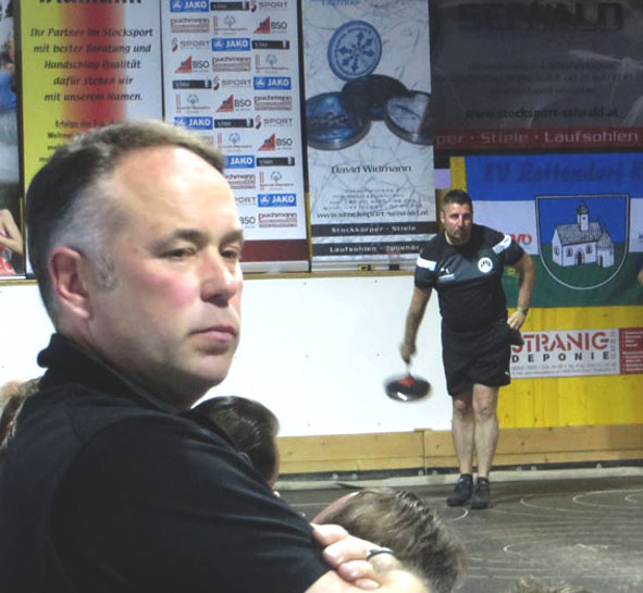 In der schmucken, mit 400 Fans prall gefüllten Halle in St. Urban holen die Stockschützen des EV Rottendorf (im Bild Horst Stranig beim Schuss) Samstag (17) zum großen Coup aus: Ein Heimsieg über Edla (St) wäre im vierten Gruppenspiel schon gleichbedeutend mit dem Einzug in die K.o.-Phase! "Edla ist sicher der härteste Brocken" sagt "Gogo" Stranig in Erinnerung an das 2:8 auswärts...