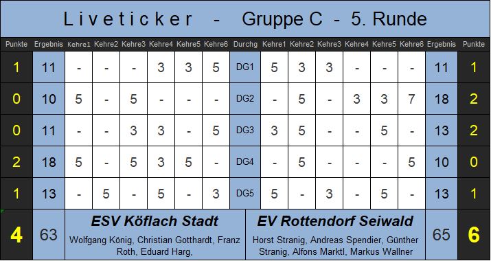 Das Spiel begann auf hohem Niveau und endete mit 11:11 Unentschieden, wobei Rottendorf die Chance auf den möglichen Sieg nicht nutzen konnte. Im zweiten Durchgang machten es die Kärntner besser und gingen mit einem 3:1 Vorsprung in die Pause. Entscheidend für die starke Vorstellung des Kärntner Top-Teams war die Rückkehr des „Bombers“ - Andreas Spendier, der nach seiner Rekonvaleszenz die Schlagkraft der Tiebelstädter deutlich nach oben schraubte. Rottendorf war nach der Pause sofort wieder auf Betriebstemperatur, wehrte erfolgreich den Ansturm des Heimteams ab und gewann den dritten Durchgang mit 13:11. Köflach lag nun 1:5 zurück, kämpfte weiter um das Unentschieden und verkürzte auf 3:5. Der letzte Durchgang blieb bis zur letzten Kehre spannend und endete mit einem 13:13 Unentschieden das für Rottendorf den Sieg in diesem Duell bedeutete. Aufgrund der überraschenden Niederlage von Edla im Parallelspiel gegen Abersee ist Rottendorf bereits fix im Viertelfinale dabei.